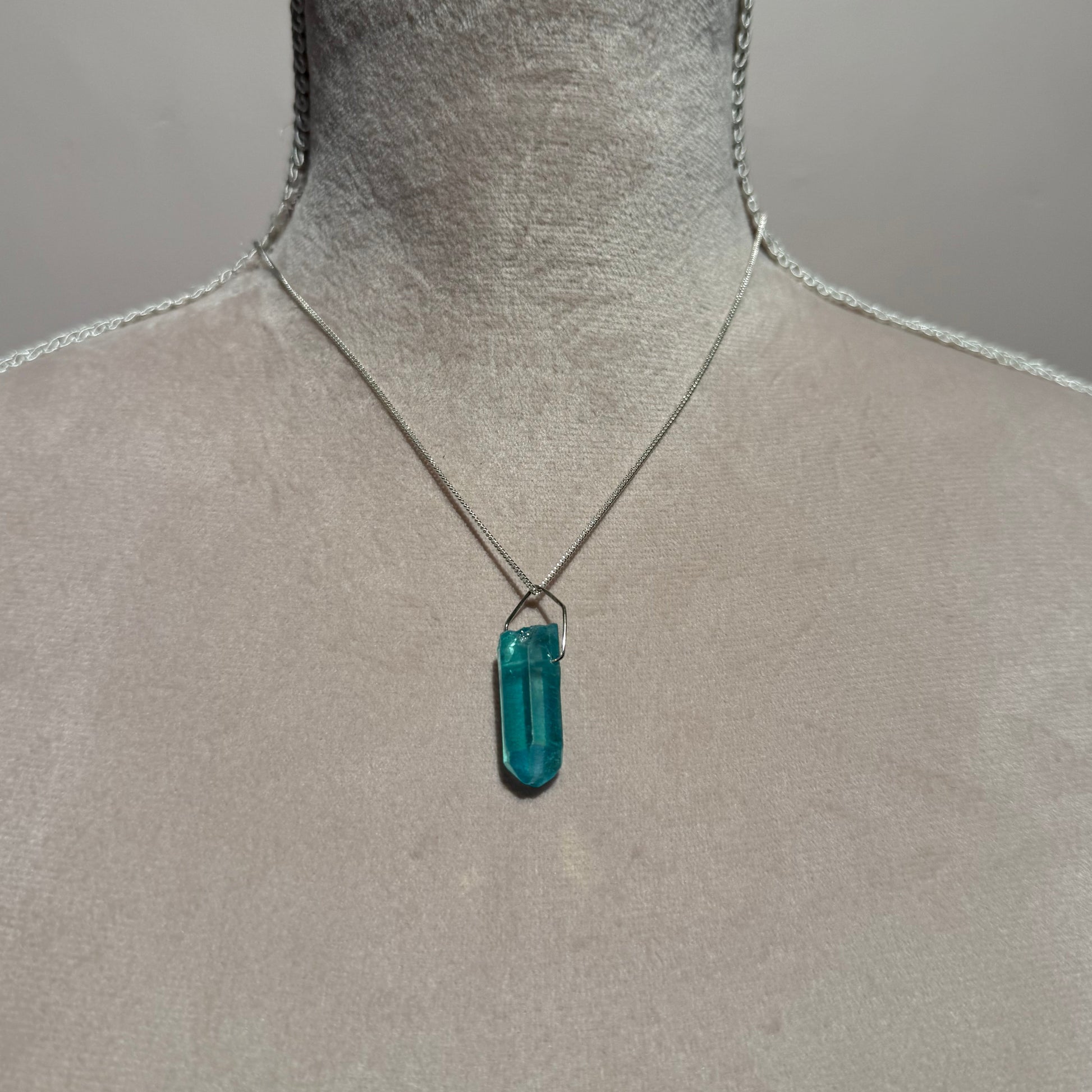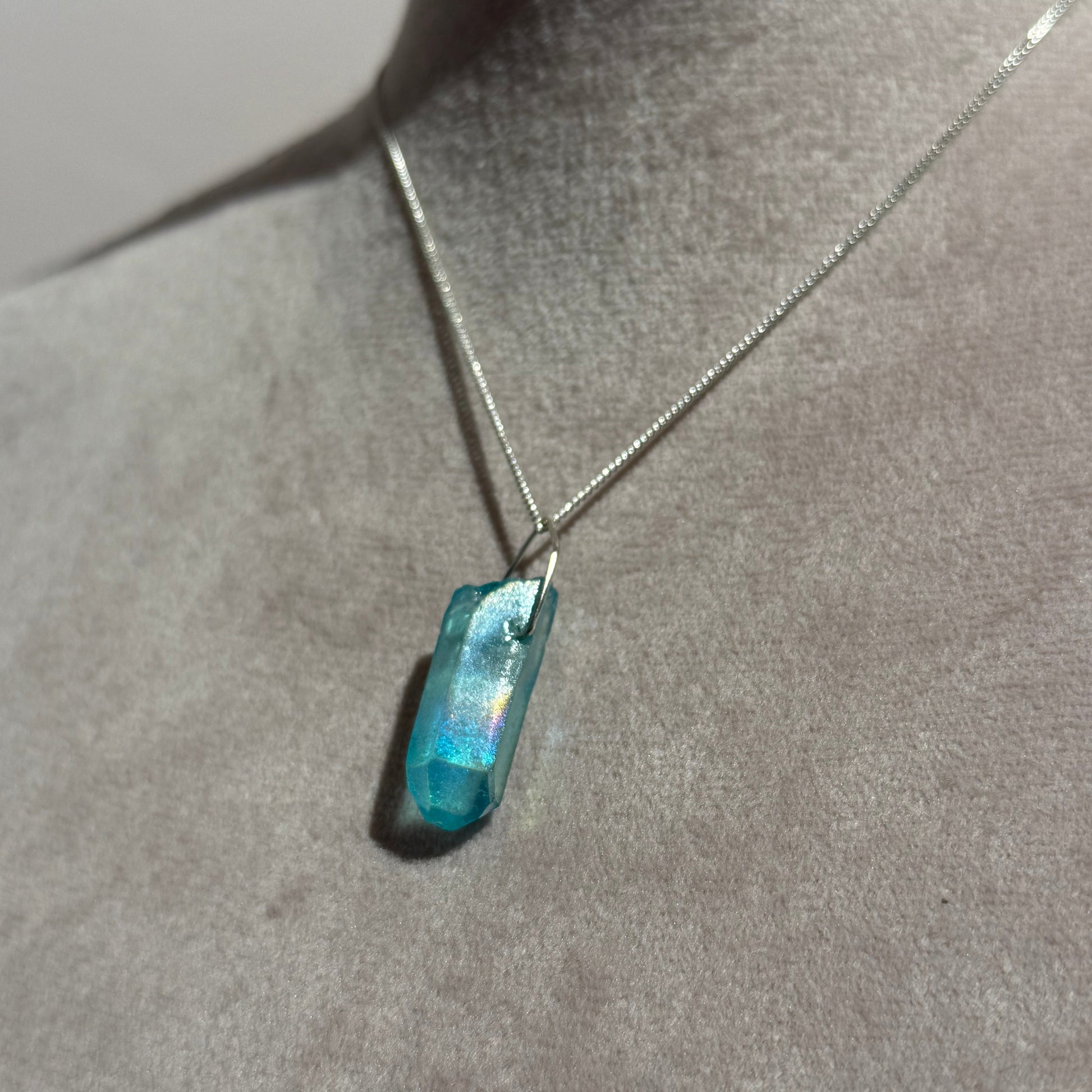 Silver necklace with crystal pendant. AQUA BLUE TITANIUM QUARTZ is clear quartz with a vaporized layer of titanium & other metals, creating a metallic blue & iridescent sheen. The titanium layer is associated with strength and power, while the quartz enhances these qualities.gorgeous aqua blue titanium quartz.