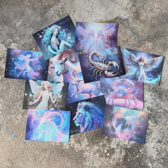 Astrovykort med zodiakens 12 olika tecken. Välj soltecken, ascendent, måntecken eller varför inte tecknet för den norra noden i födelsehoroskopet. Korten är superfina att rama in, eller ge bort i present. Vit baksida med rosa atelier Desirée-logga. Soltecknens ungefärliga datum finns i parentes nedan (varierar något från år till år).