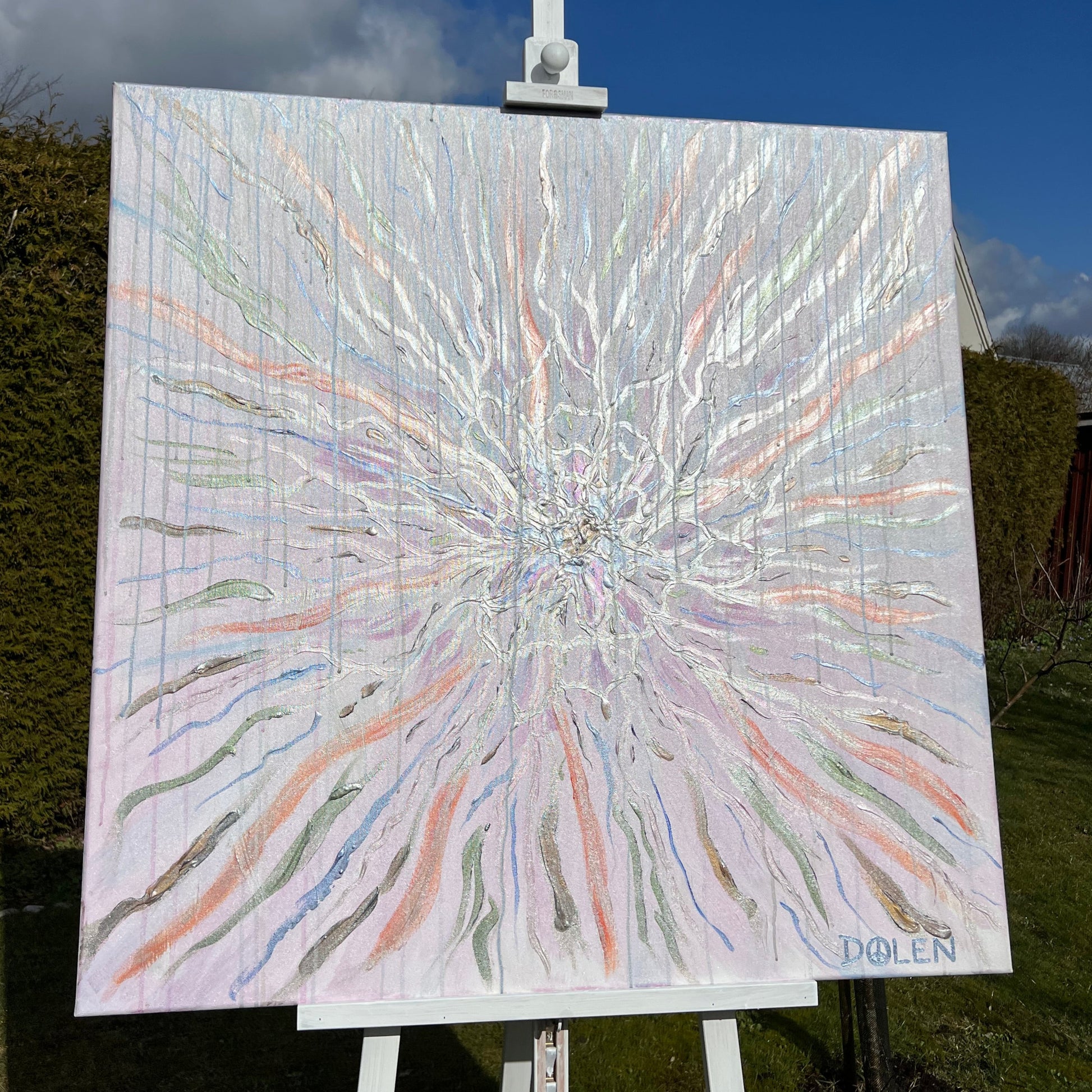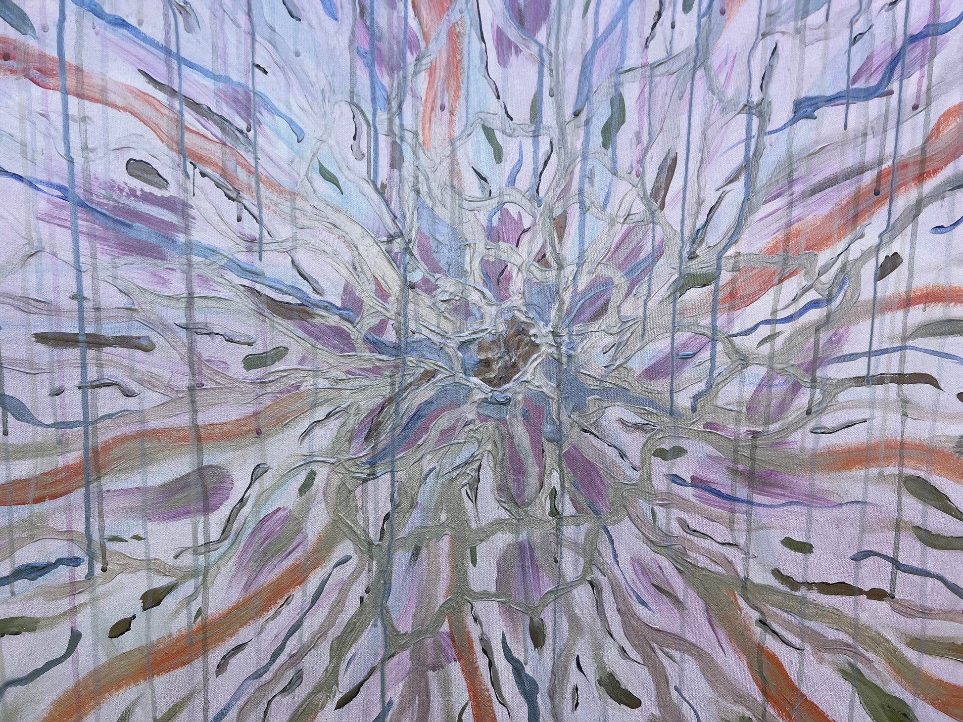 story: There lies deep intelligence in all cells. This art work holds remembrance of the connections & layers we can’t see with the naked eye. Pearlescent shades of Orange, Light Blue, Bronze & Silver, work in a mycelium of higher intelligence. Let the magic emit from the painting & activate reparation & calibration within you.