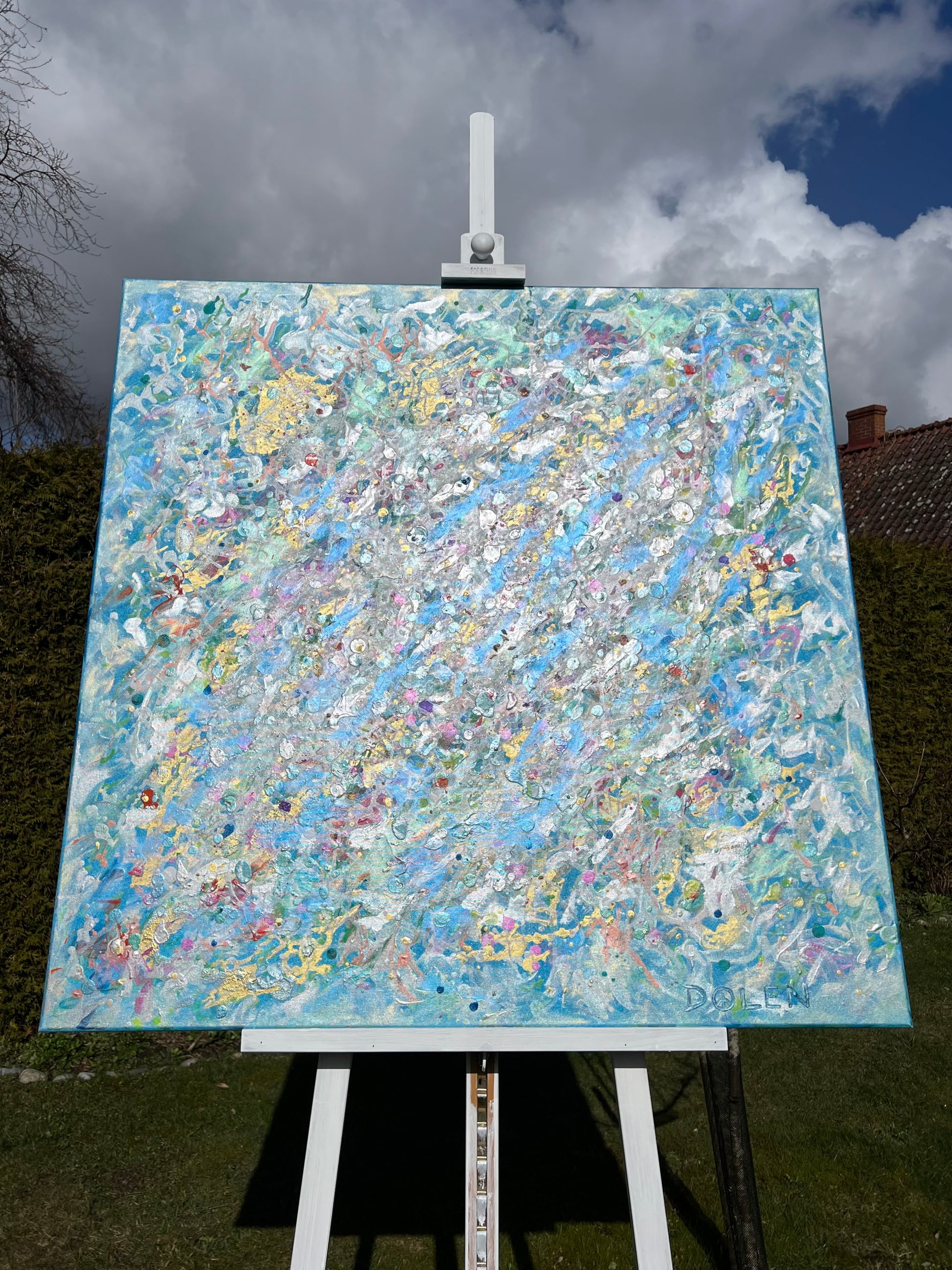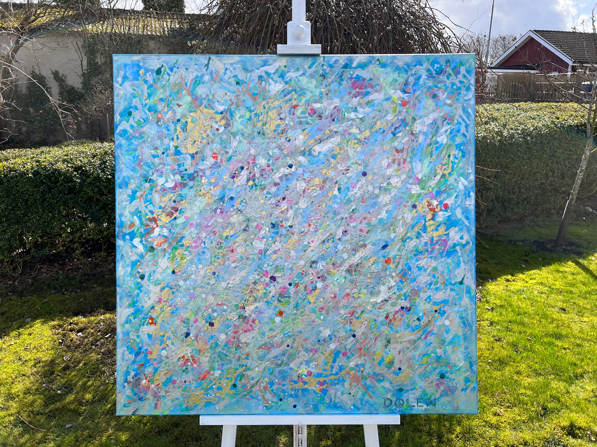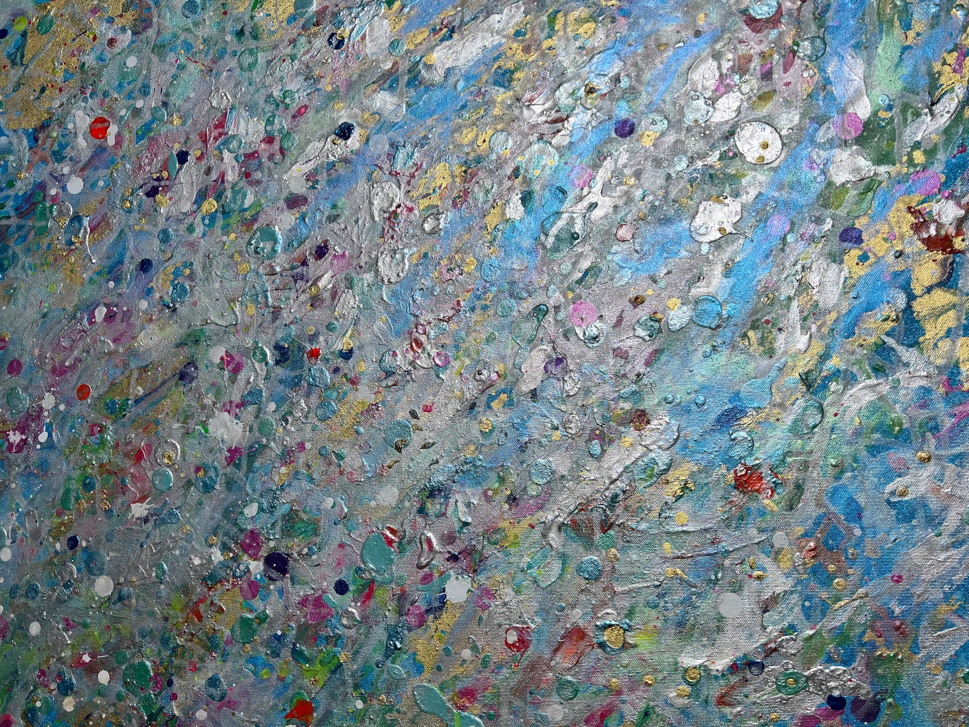 story: This is painting number 3/3 in the “EXTASEN-SERIES”. This is the final explosion, the culmination of galactic ecstacy. The shimmery cluster of multicolors, reveals interwoven star systems and star families: we’re all one, we’re all connected in a myriad of small little points of light in all the colors of the rainbow…