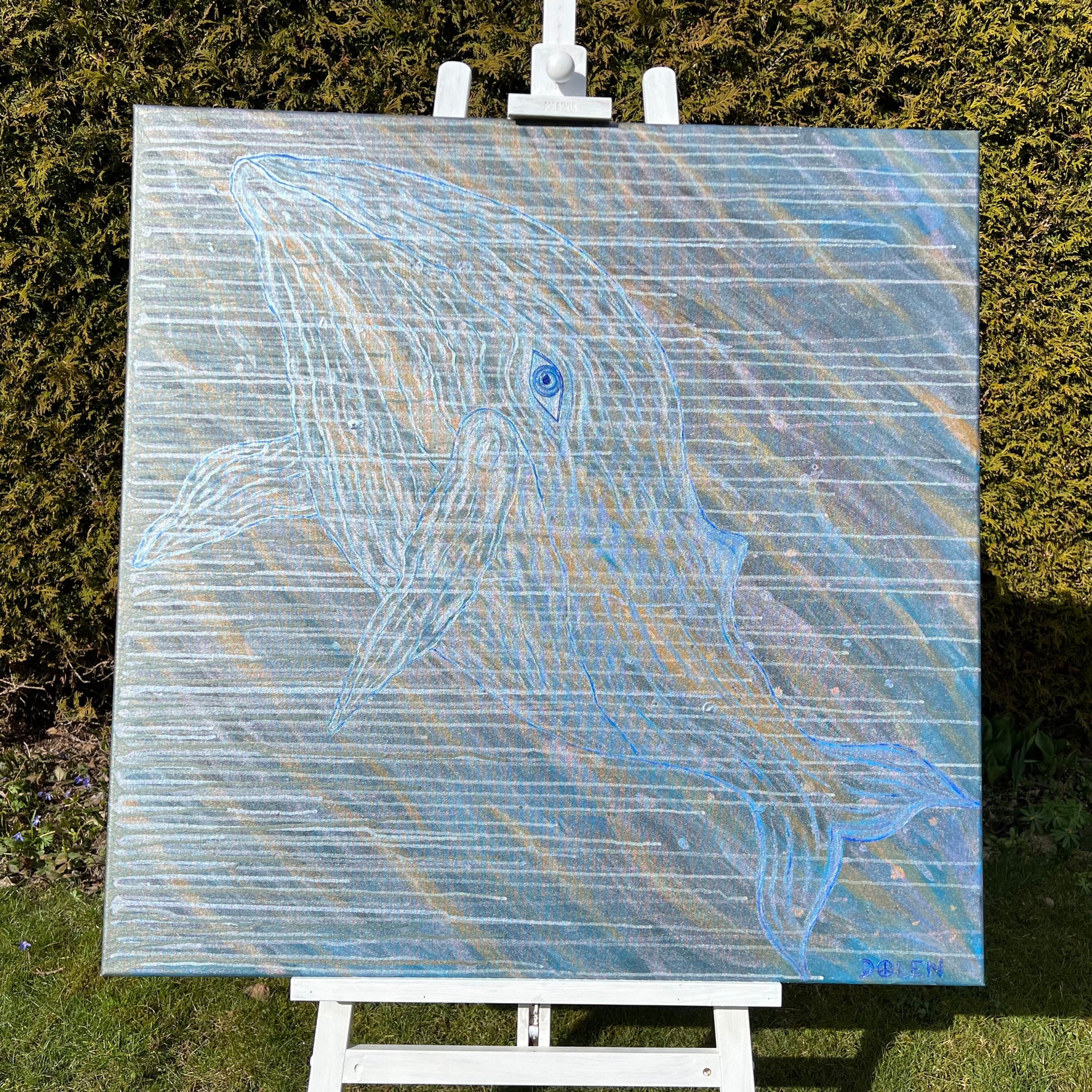 story: The eye of the storm… the galactic whale moves freely beyond realms & worlds. It is the keeper of wisdom codes from eons of time. In pearlescent shades of Grey, Blue, Silver & Bronze, it swims from ocean to ocean. Look it in the eye & activate the total center & core of your soul self. ..