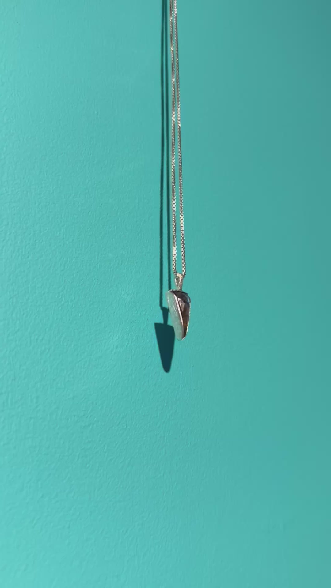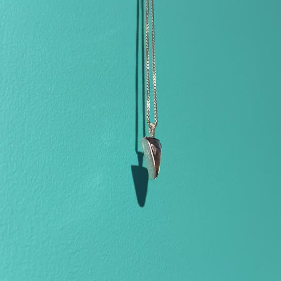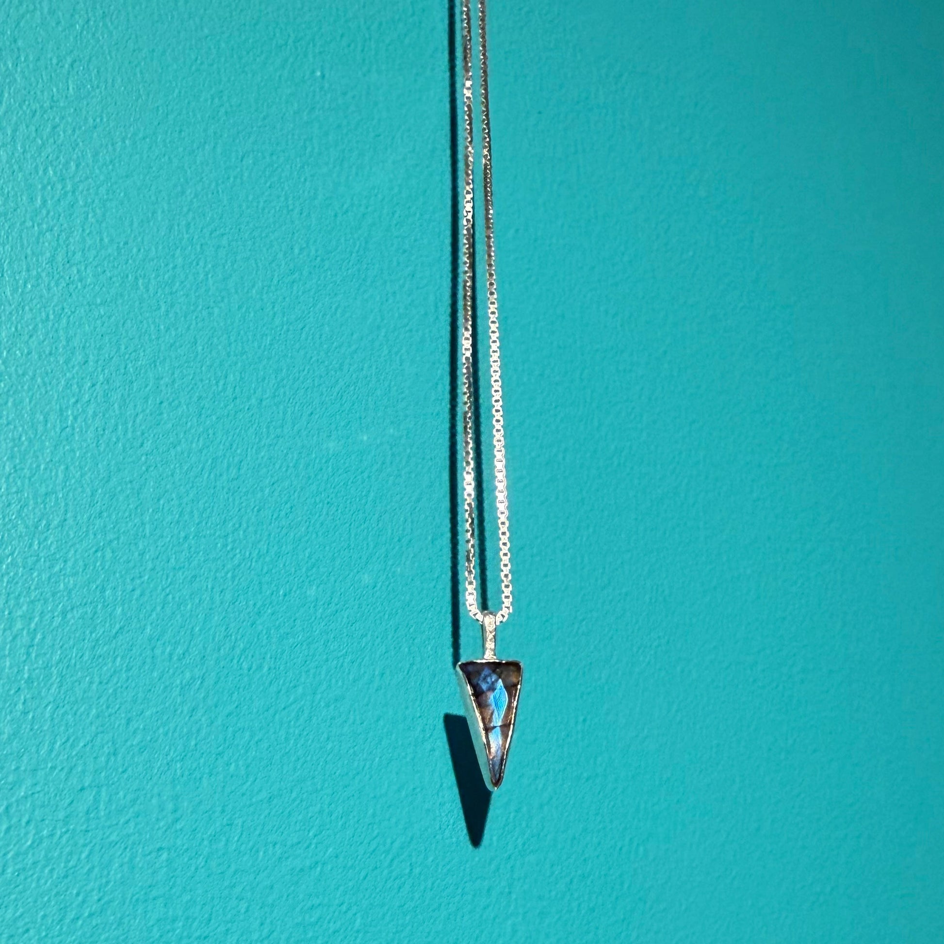 Silver 925 necklace with a gorgeous triangular checker cut LABRADORITE. This feldspar mineral has mesmerizing optical phenomenon, labradorescence, that invites the bearer to explore the internal and external worlds. With its layers of dazzling flashes of colors, Labradorite is often used in spiritual practices, as it is a portal to other realms. Labradorite resembles the magic of Northern Lights.