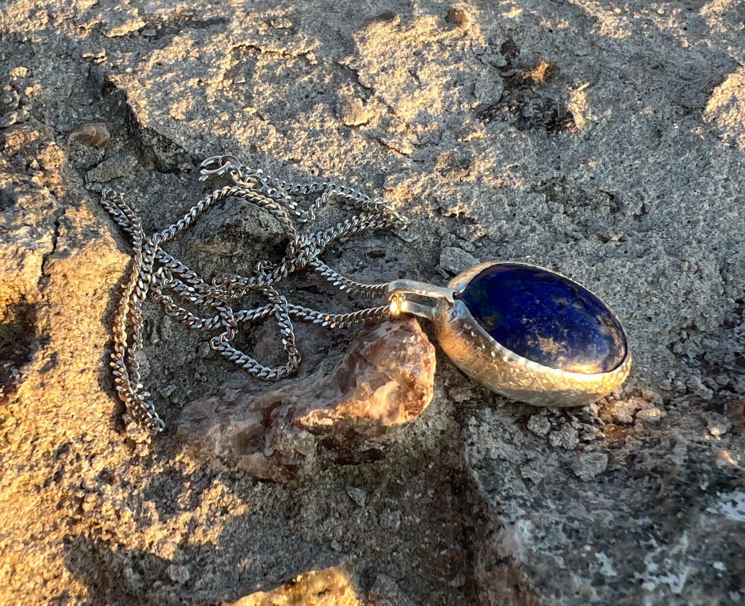 During the process of finalizing this Lapis Lazuli, I was guided to create all these dented dots around the bezel. I polished with the burnisher and thought I was done several times, but no, I was guided to create the texture of the medallion almost like a crater, rugged and textured. It’s as if one would be transported into space while touching and feeling it with human hands, or as it rests towards the skin on the high-heart chakra.