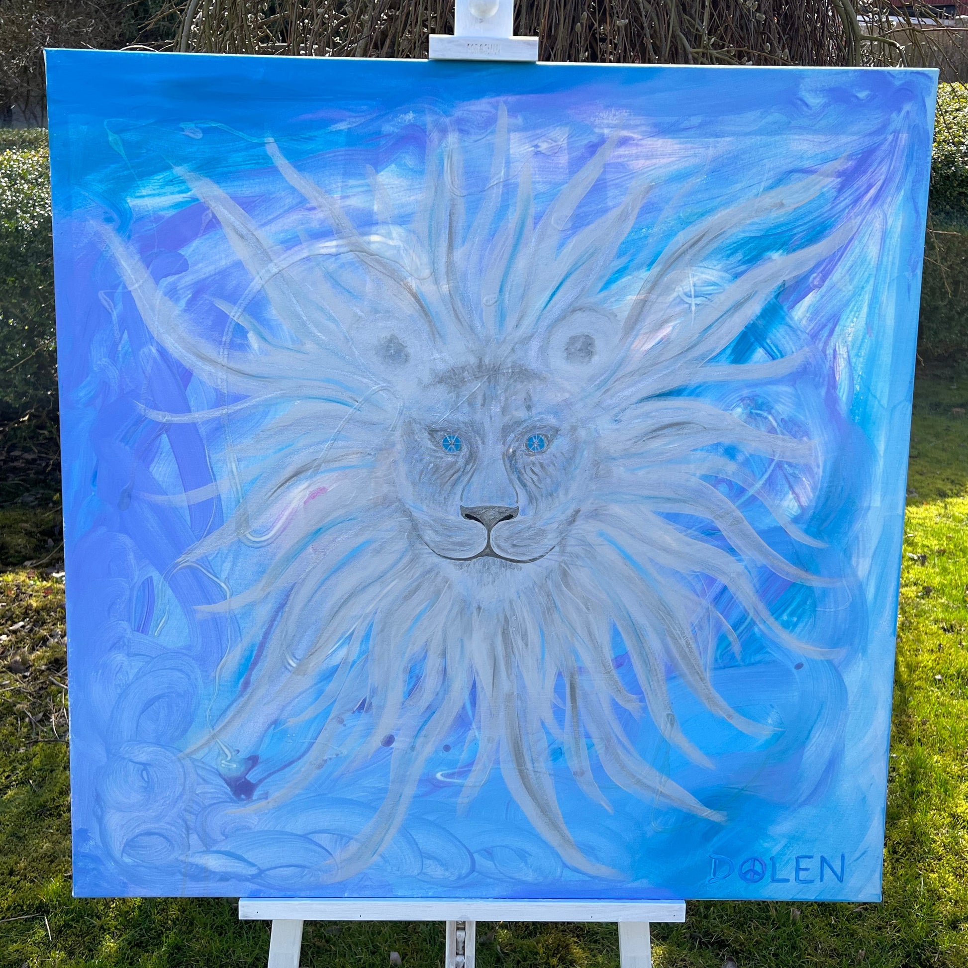 story: This majestic lion/lioness in pearlescent shades of Turquoise & Purple, holds divine union codes. sHE comes with a message: