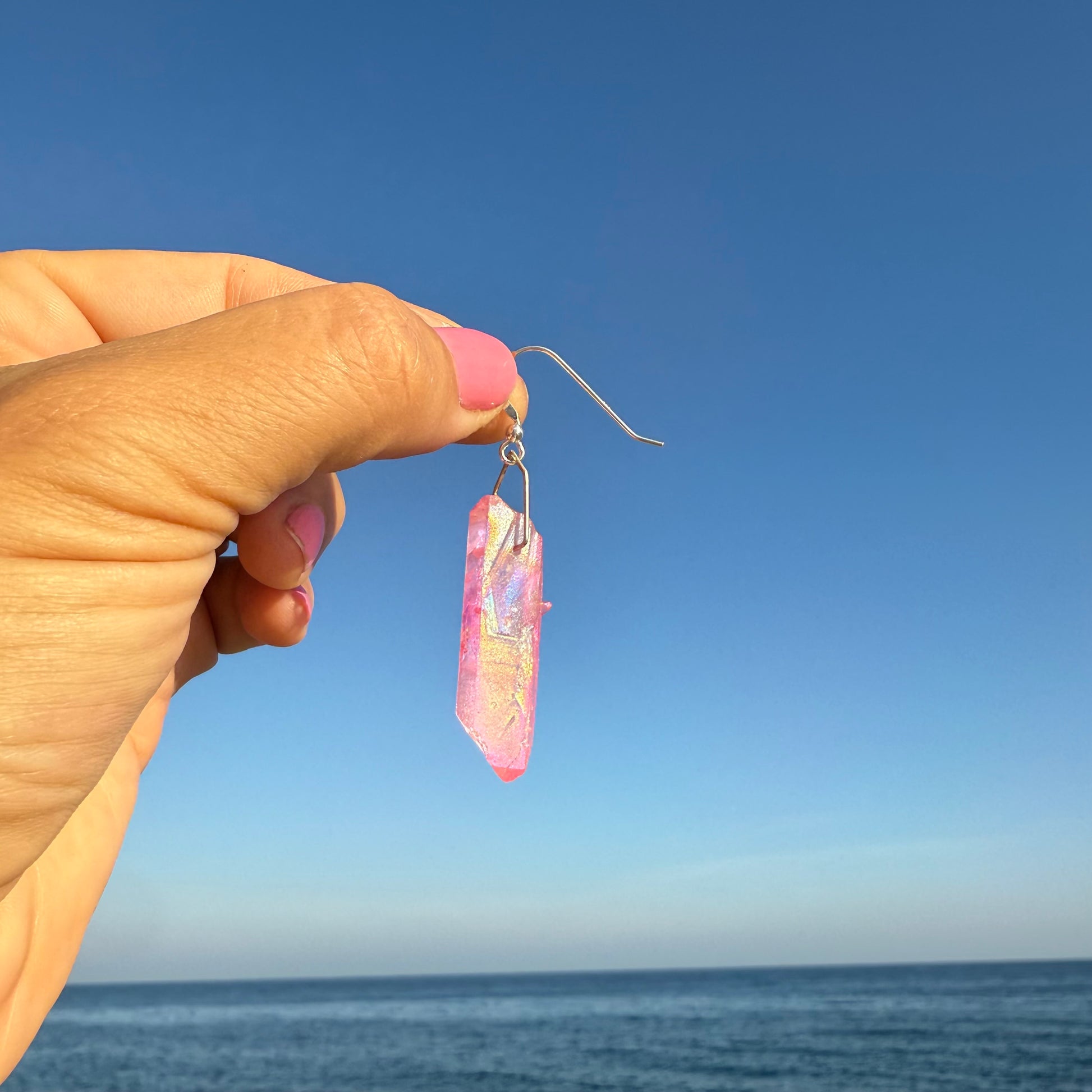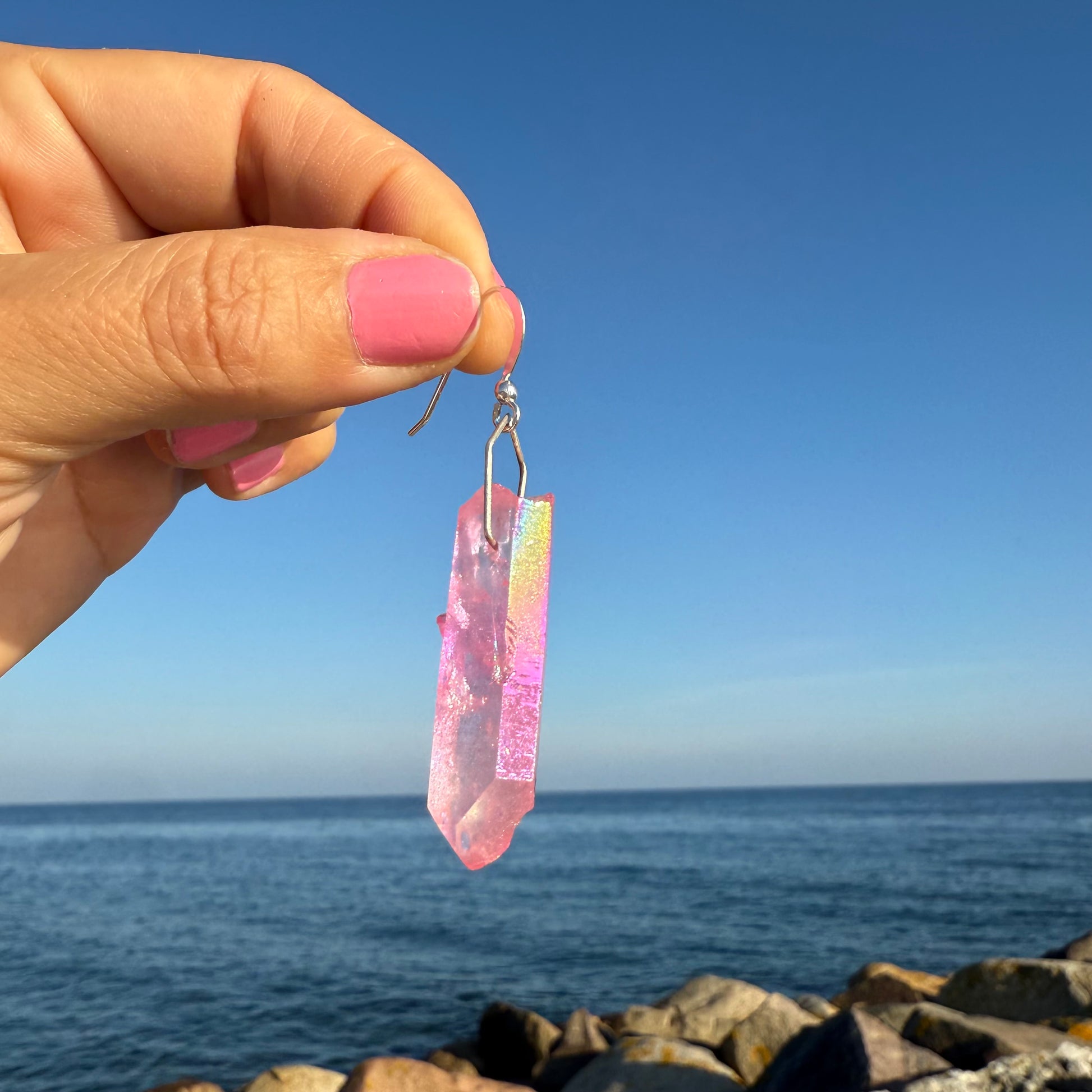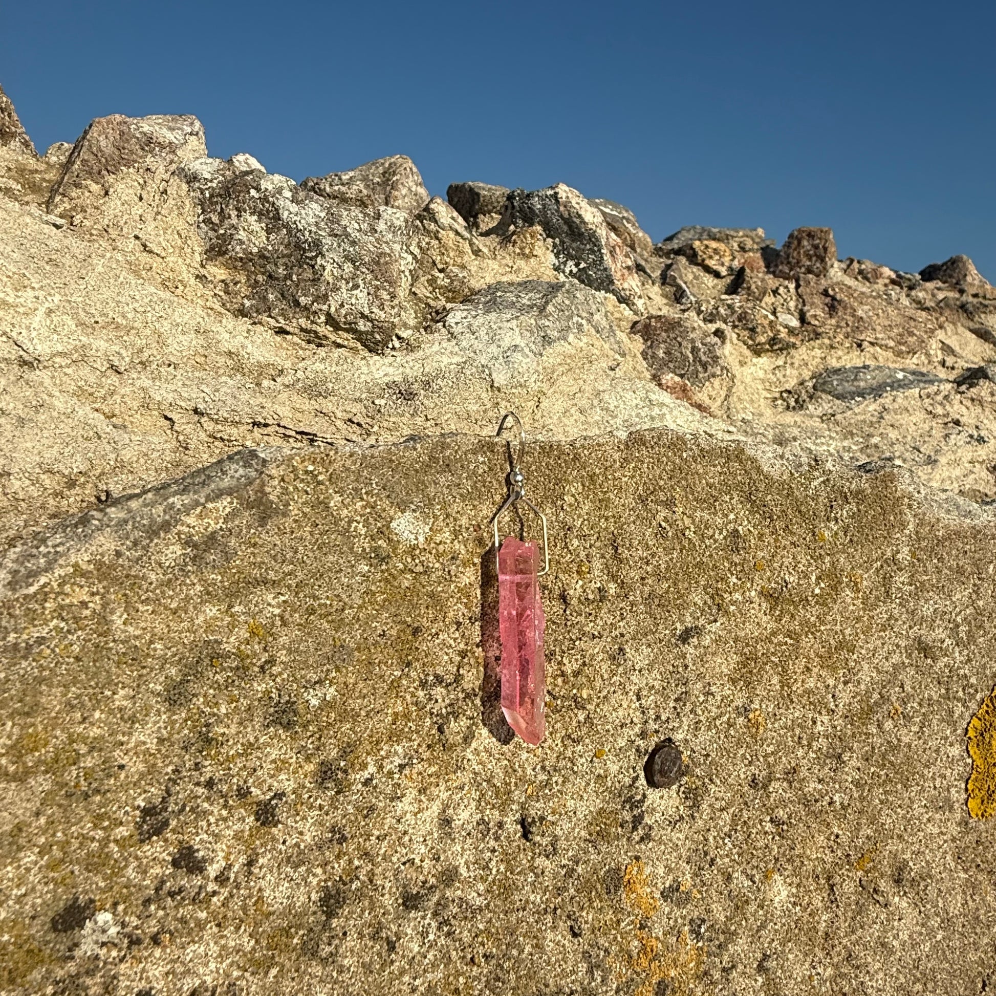 Mono earring in silver 925 with raw crystal pendant. PINK TITANIUM QUARTZ is clear quartz with a vaporized layer of titanium & other metals, creating a metallic pink & iridescent sheen. The titanium layer is associated with strength and power, while the quartz enhances these qualities.