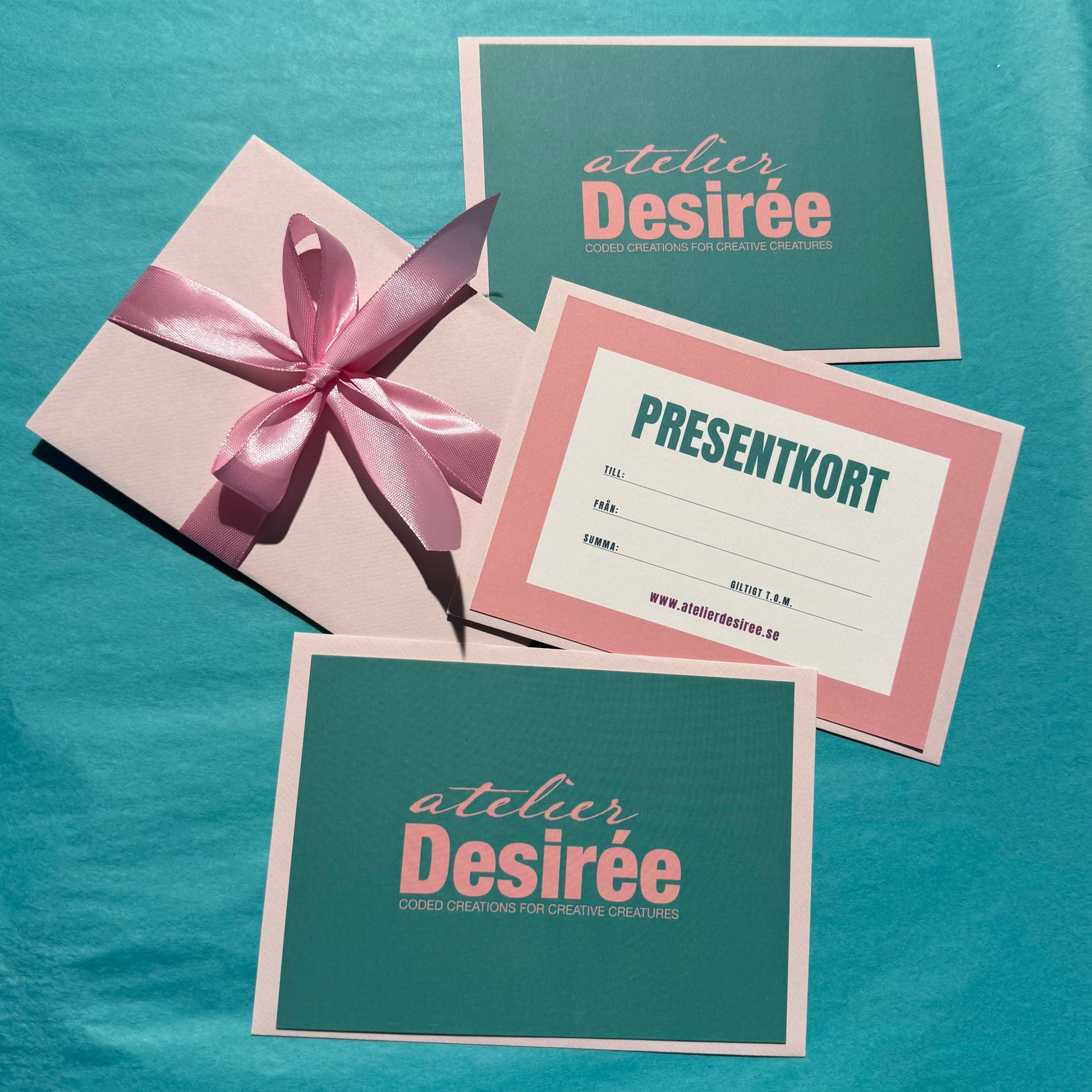 Vet du inte exakt vad du ska ge bort? Ett presentkort ger valfrihet att boka workshop eller retreat, köpa keramik, smycken, konst eller något annat från atelier Desirée. Presentkortet är giltigt 1 år från inköpsdatumet.