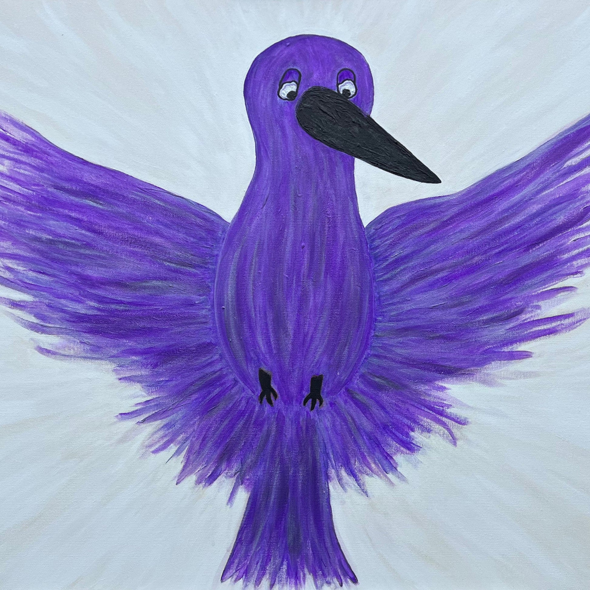 story: Little Purple Birdie is a fun and focused creature. If you ever find yourself wondering and thinking too much, lean into her wings and let her spirit clear your visions. This painting holds frequencies of pearlescent Purple & White.