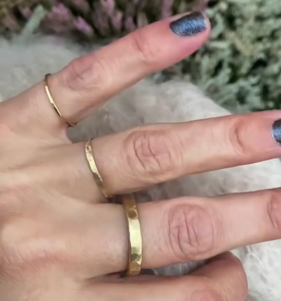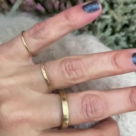 The thinnest of the 18K GOLD rings feel like a second skin. Hammered, yet smooth, it is sheer, yet a staple. Stack or wear solo, as thumb ring, upperfingerring or simply as a regular ring.