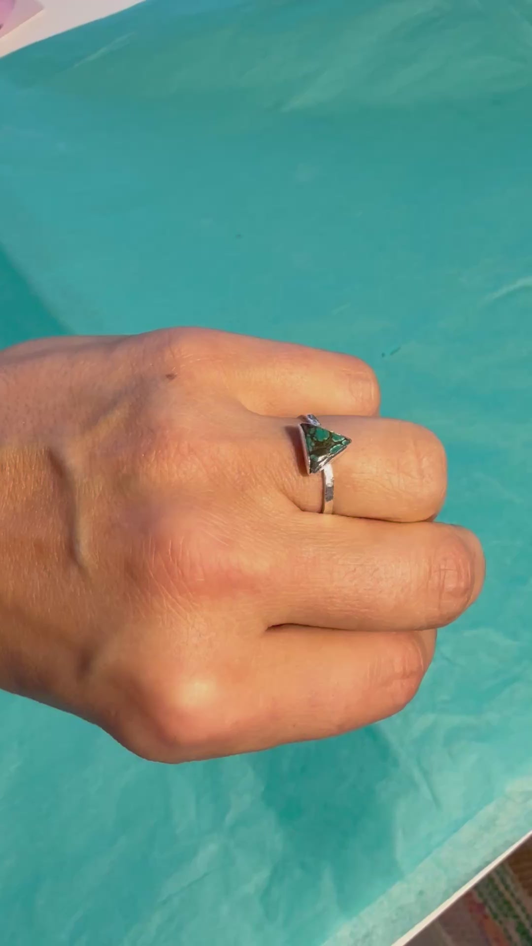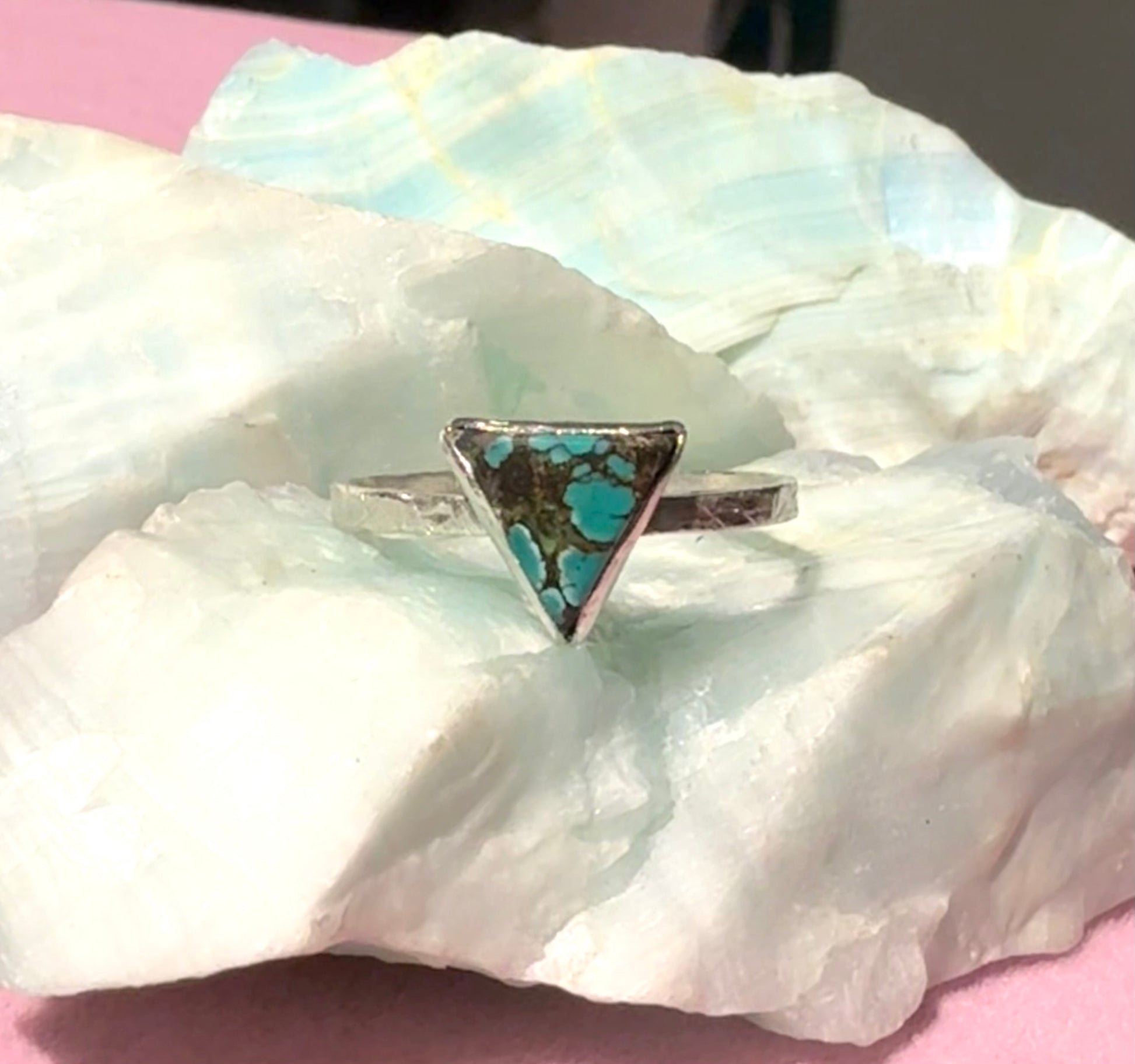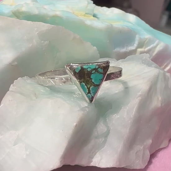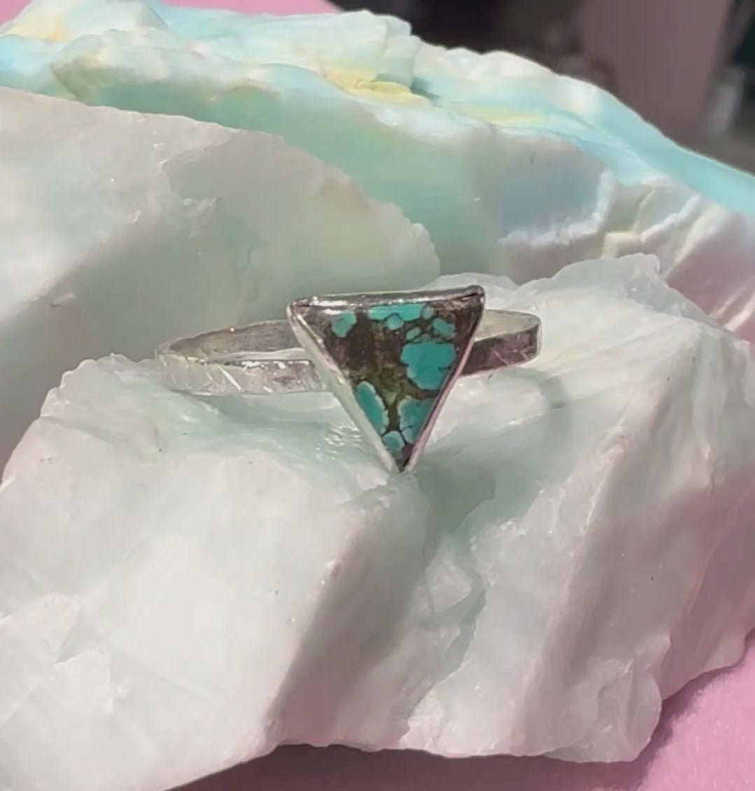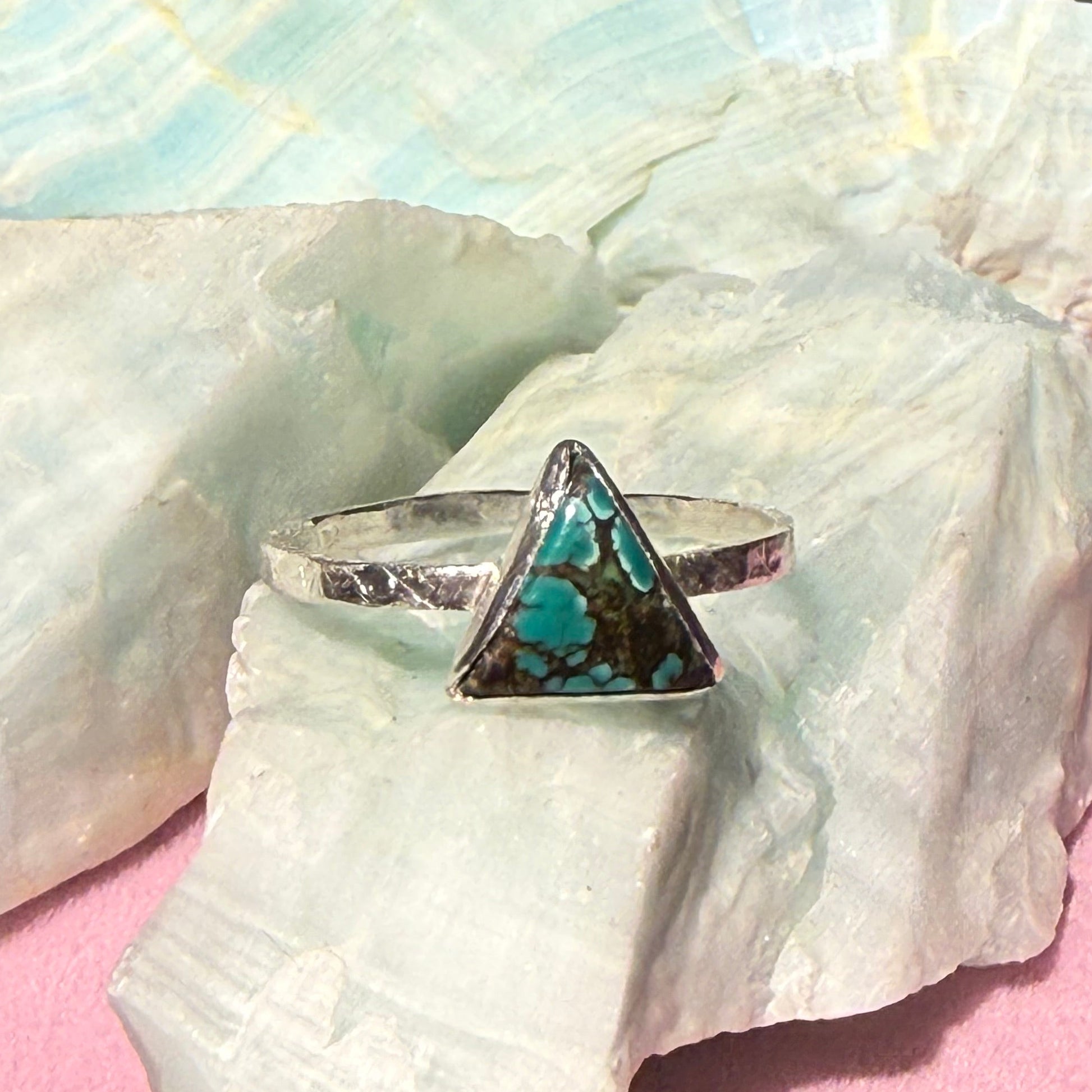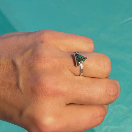 Triangle-shaped Turquoise set on a hammered and brushed silver 925 ring.